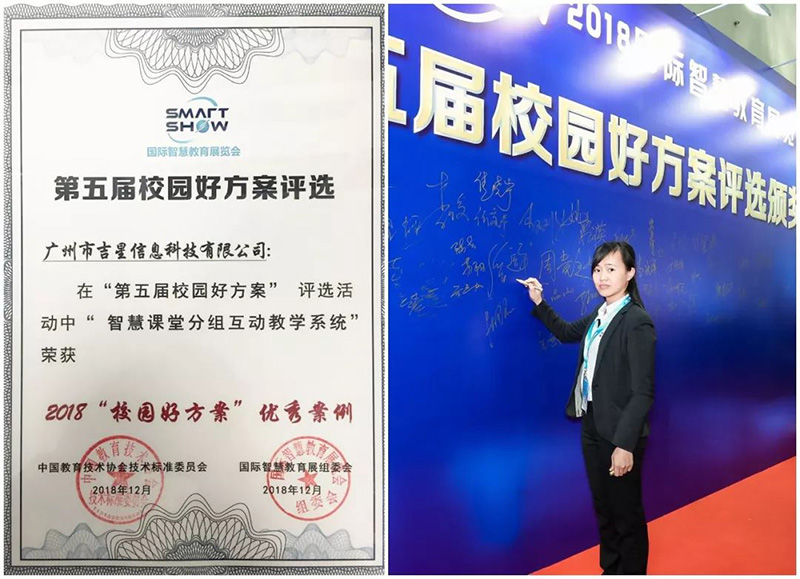 在2018國際智慧教育展上,吉星展示了基于數(shù)字化校園以學(xué)生為中心的智慧課堂分組互動(dòng)教學(xué)系統(tǒng)方案收獲了客戶的一致好評(píng),并榮獲 2018“校園好方案”優(yōu)秀案例,吉星信息科技被評(píng)為2018智慧教育十大創(chuàng)新應(yīng)用品牌!