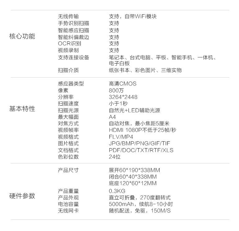 核心功能 無線傳輸、手勢(shì)識(shí)別掃描、智能感應(yīng)掃描、智能糾偏裁邊、OCR識(shí)別、視頻錄制等